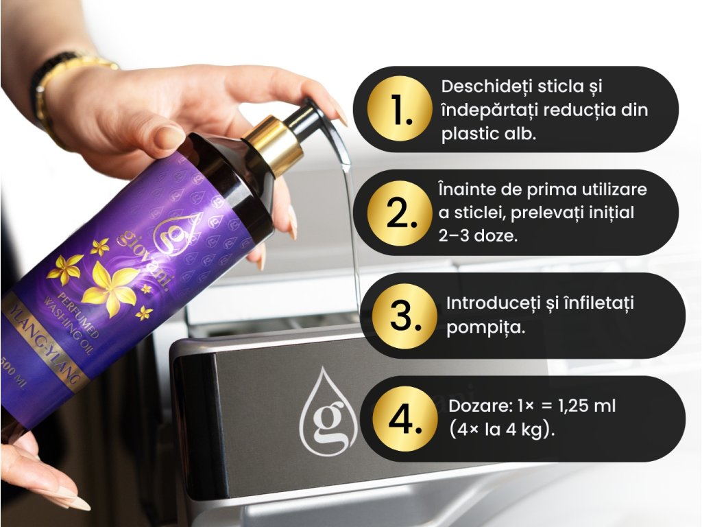 Adăugați această pompă de designer la parfumul dumneavoastră de rufe pentru un preț simbolic. Marca Giovani® vă permite să alegeți modul în care aplicați parfumul nostru de rufe în recipientul de balsam de rufe: