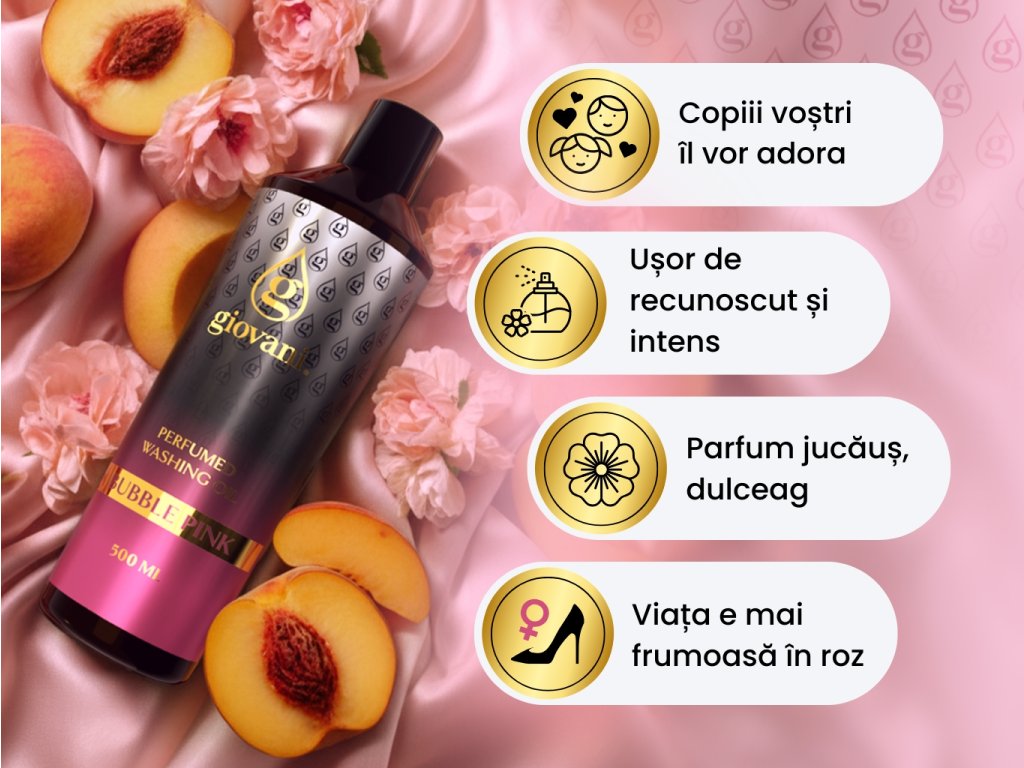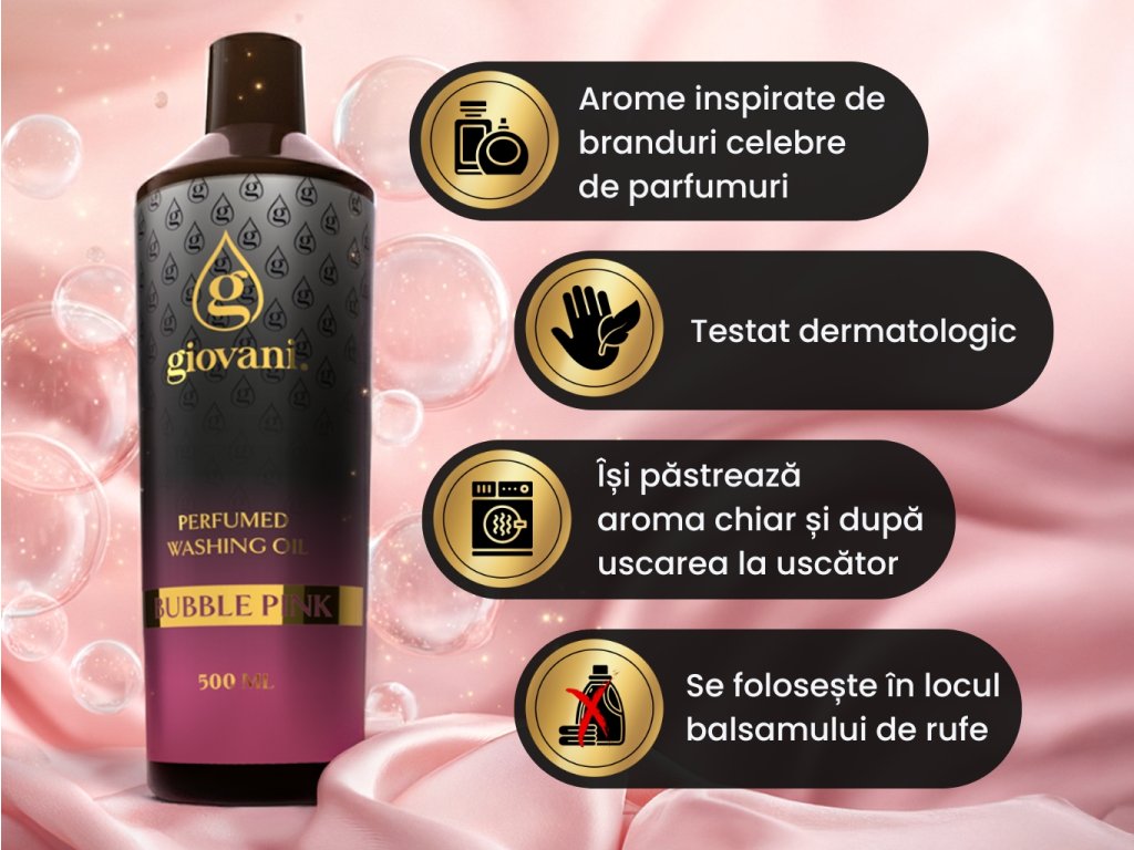 Descoperiți o dulceață irezistibilă cu Bubble Pink, fermecătorul parfum de rufe de la Giovani®. Combinația sa unică de esențe dulci creează un parfum intens și de lungă durată care învăluie rufele într-o aromă irezistibilă.