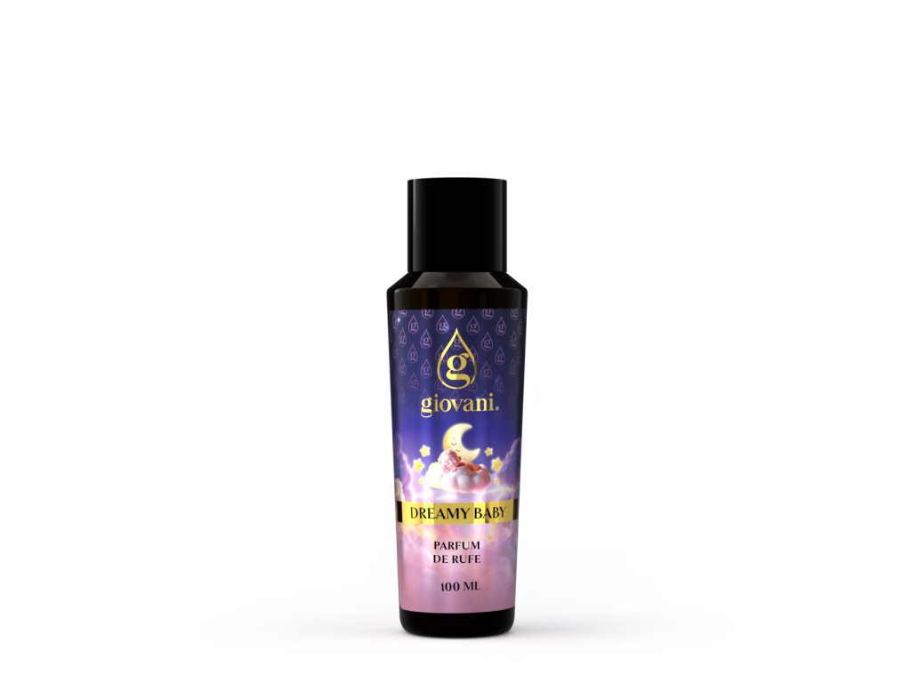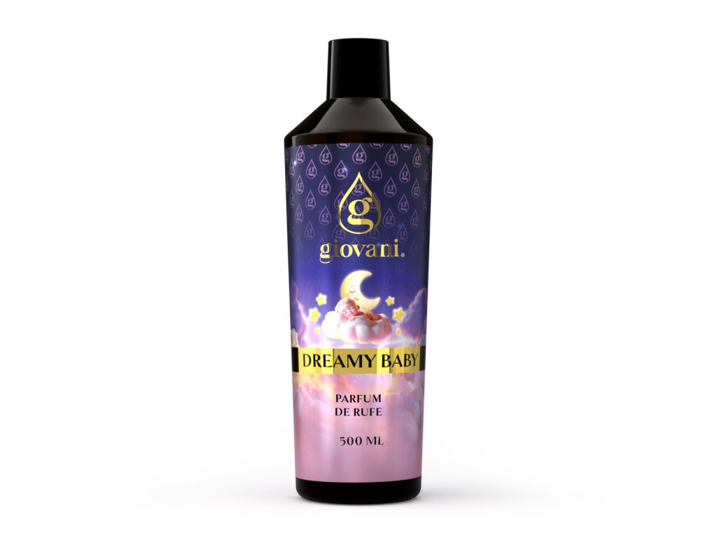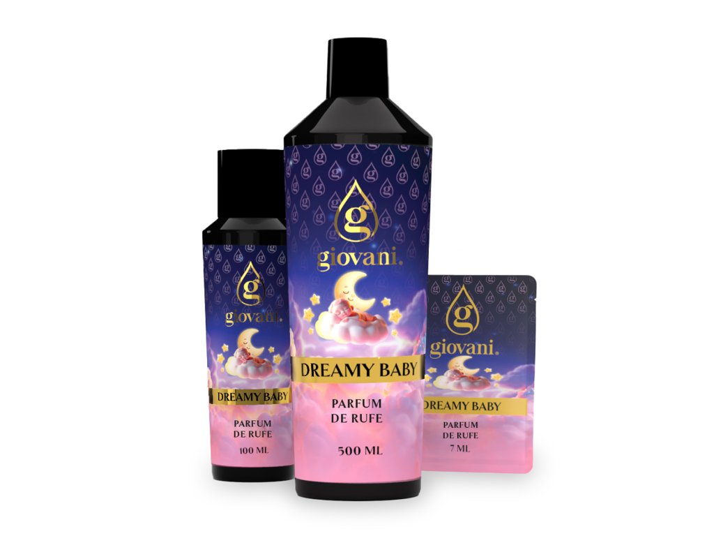 Esențele parfumului de rufe Giovani® DREAMY BABY sunt florale-pudrate, cu o notă de prospețime. Revigorantele note verzi și bergamotă deschid calea spre inima delicată a parfumului, unde se împletesc flori de portocal, trandafir, iasomie, violetă și heliotrop peruvian. Baza este formată din catifelatul mosc, cremoasa vanilie și caldul lemn de santal. Această compoziție armonioasă răsfață simțurile și, în același timp, este blândă chiar și cu cea mai sensibilă piele.