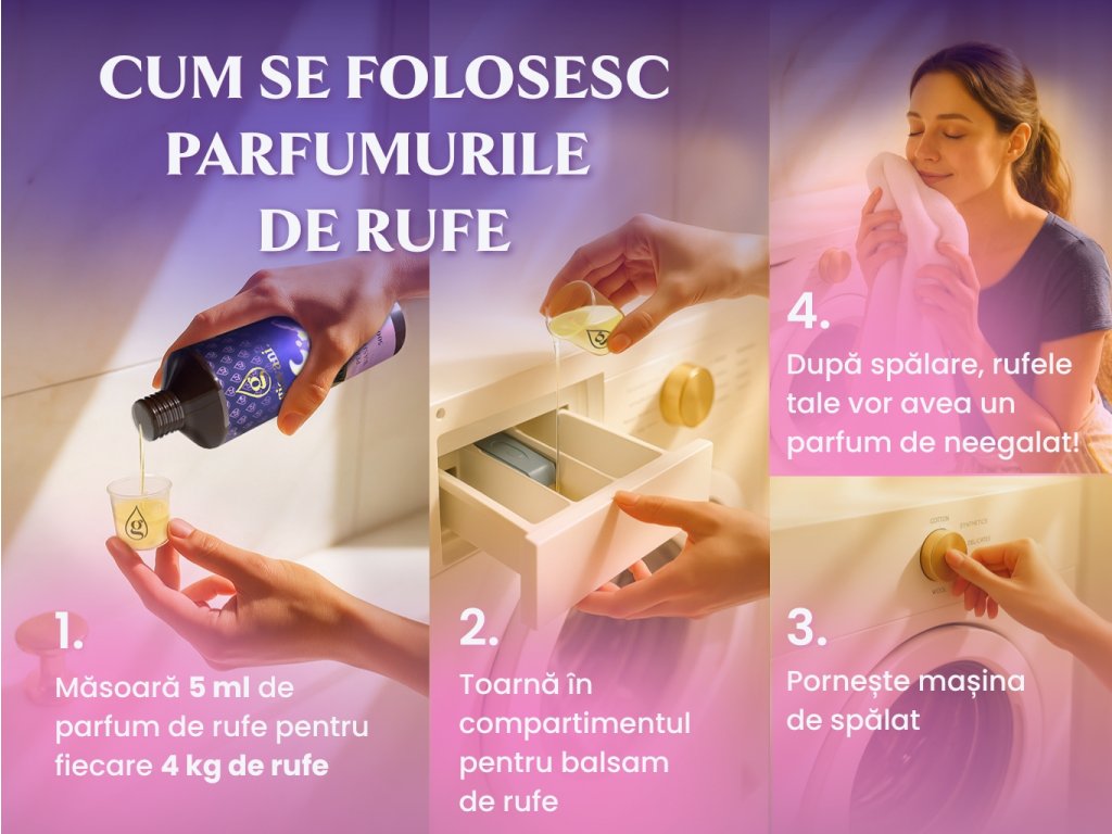 Nu puneți parfumul în tamburul mașinii de spălat sau în uscătorul de rufe. Acestea sunt destinate direct utilizării în recipientul de balsam de rufe. Nu trebuie să vă faceți griji că rufele dvs. își vor pierde parfumul după uscarea în uscător. Parfumurile Giovani® sunt rezistente la influențe externe și durabile. Rufele spălate vor mirosi chiar și după folosirea uscătorului. Temperatura optimă pentru depozitarea uleiurilor de rufe este de aproximativ 15-25 grade Celsius.