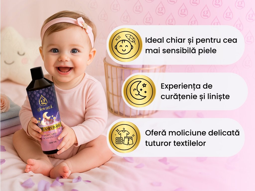 Un parfum plin de delicatețe și finețe. DREAMY BABY evocă atmosfera inocenței copilărești, a lenjeriei proaspăt spălate și a grijii tandre. Alegerea ideală pentru spălarea lenjeriei de pat, a hainelor pentru copii sau a prosoapelor pufoase.