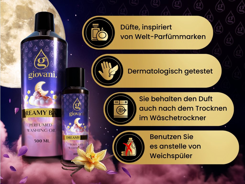 Giovani® este un brand exclusivist și de lux de parfumuri pentru rufe. Am avut mare grijă să asigurăm calitatea lor înaltă. Atunci când am dezvoltat aceste parfumuri, a fost important pentru noi să obținem o intensitate puternică și o durabilitate îndelungată a acestora, astfel încât să putem vorbi despre Giovani® ca despre marca de parfumuri pentru rufe de cea mai bună calitate de pe piață. Marele lor avantaj este că nu înfundă mașina de spălat, nu lasă reziduuri grase și nu pătează hainele. Datorită conținutului unor substanțe, uleiurile noastre au grijă și de culoarea rufelor dumneavoastră. Acestea sunt vegane, nu conțin dioxan, SVHC, parabeni, substanțe PBT/vPvB, metale grele, reziduuri poluante, microplastice sau nanoplastice. Ceea ce contribuie la unicitatea mărcii Giovani® este designul său luxos. De asemenea, ne lăudăm cu o livrare în 24 de ore și cu un serviciu clienți rapid. |