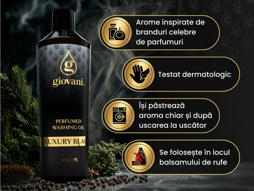 O combinație de uleiuri de parfum piperate și florale creează o experiență olfactivă supremă sub forma acestui parfum aldehidic al parfumului de rufe Luxury Black de la Giovani®.