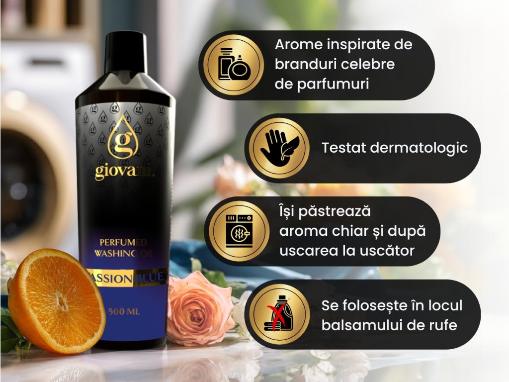 Giovani® este un brand exclusivist și de lux de parfumuri pentru rufe. Am avut mare grijă să asigurăm calitatea lor înaltă. Atunci când am dezvoltat aceste parfumuri, a fost important pentru noi să obținem o intensitate puternică și o durabilitate îndelungată a acestora, astfel încât să putem vorbi despre Giovani® ca despre marca de parfumuri pentru rufe de cea mai bună calitate de pe piață. Marele lor avantaj este că nu înfundă mașina de spălat, nu lasă reziduuri grase și nu pătează hainele. Datorită conținutului unor substanțe, uleiurile noastre au grijă și de culoarea rufelor dumneavoastră. Acestea sunt vegane, nu conțin dioxan, SVHC, parabeni, substanțe PBT/vPvB, metale grele, reziduuri poluante, microplastice sau nanoplastice. Ceea ce contribuie la unicitatea mărcii Giovani® este designul său luxos. De asemenea, ne lăudăm cu o livrare în 24 de ore și cu un serviciu clienți rapid. |