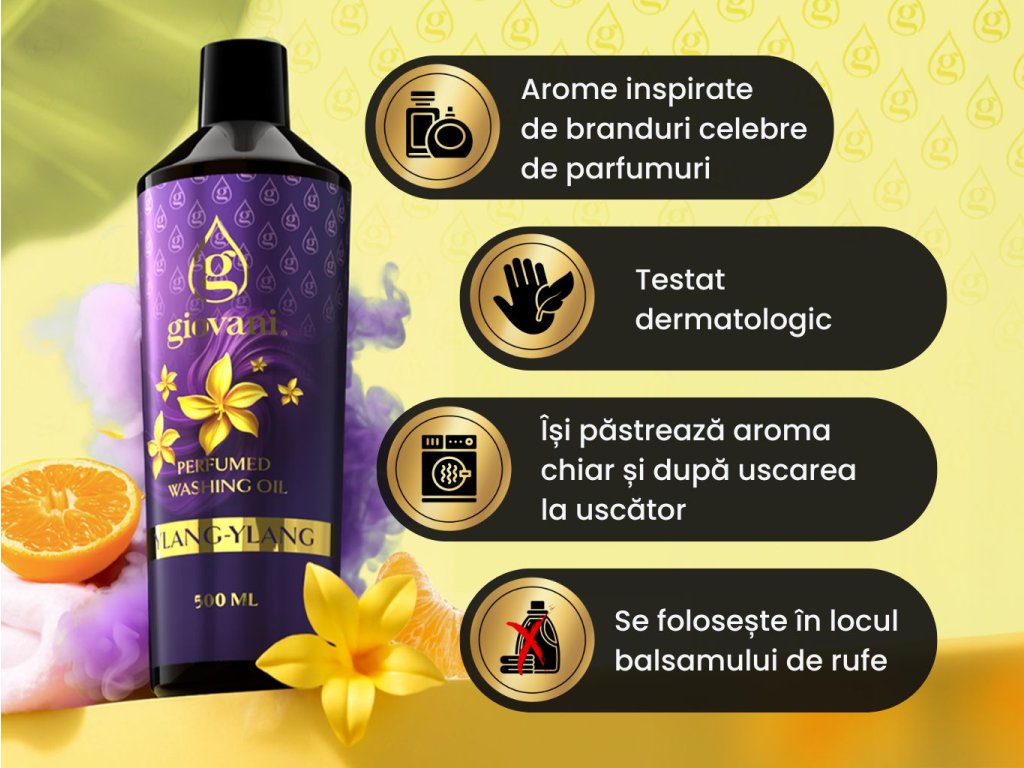 Ingredientul principal al parfumului de rufe Giovani® YLANG-YLANG provine din Insulele Comore, renumite pentru cel mai calitativ ylang-ylang din lume. În aromaterapie este folosit pentru reducerea stresului, anxietății și pentru sprijinirea unui somn odihnitor.